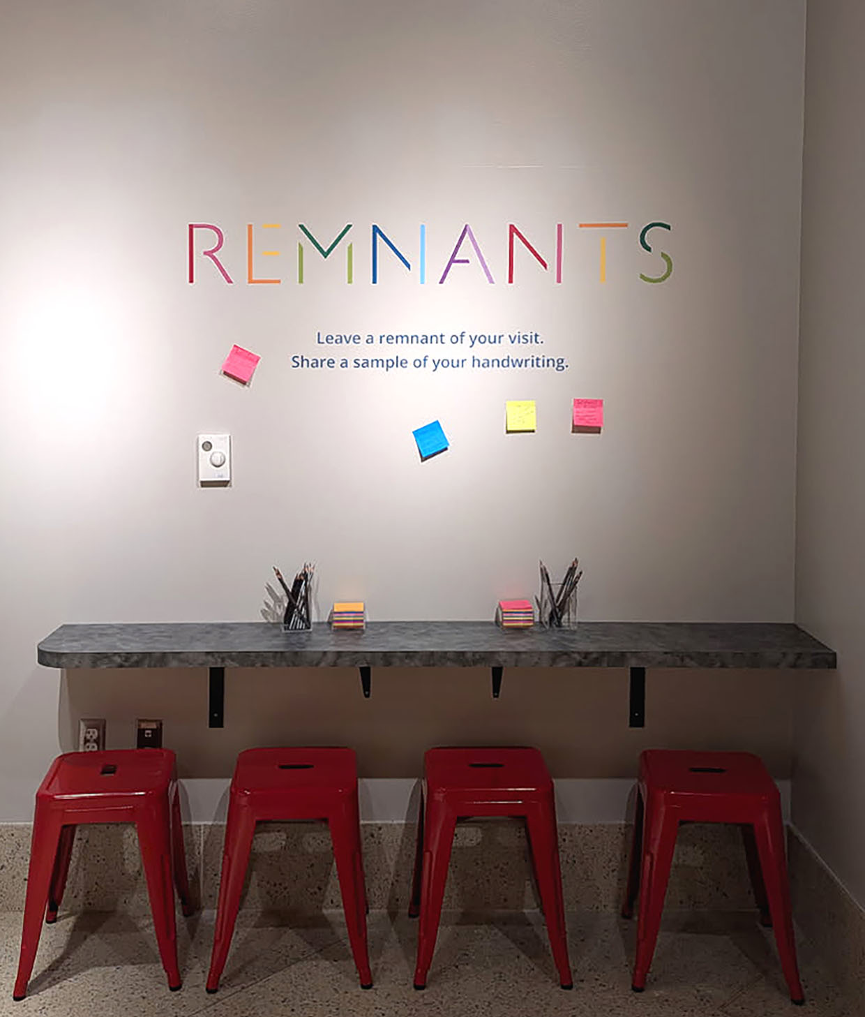 Symmetry’s title design reflected Moseley’s use of vibrant colors while referencing themes of disappearing or obscure communication systems. Exhibition graphics expanded on that branding, guiding visitors from the lobby into the gallery, sharing information about the artist and her work within the exhibition, and inviting visitors to add their mark to the exhibition in an interactive area.